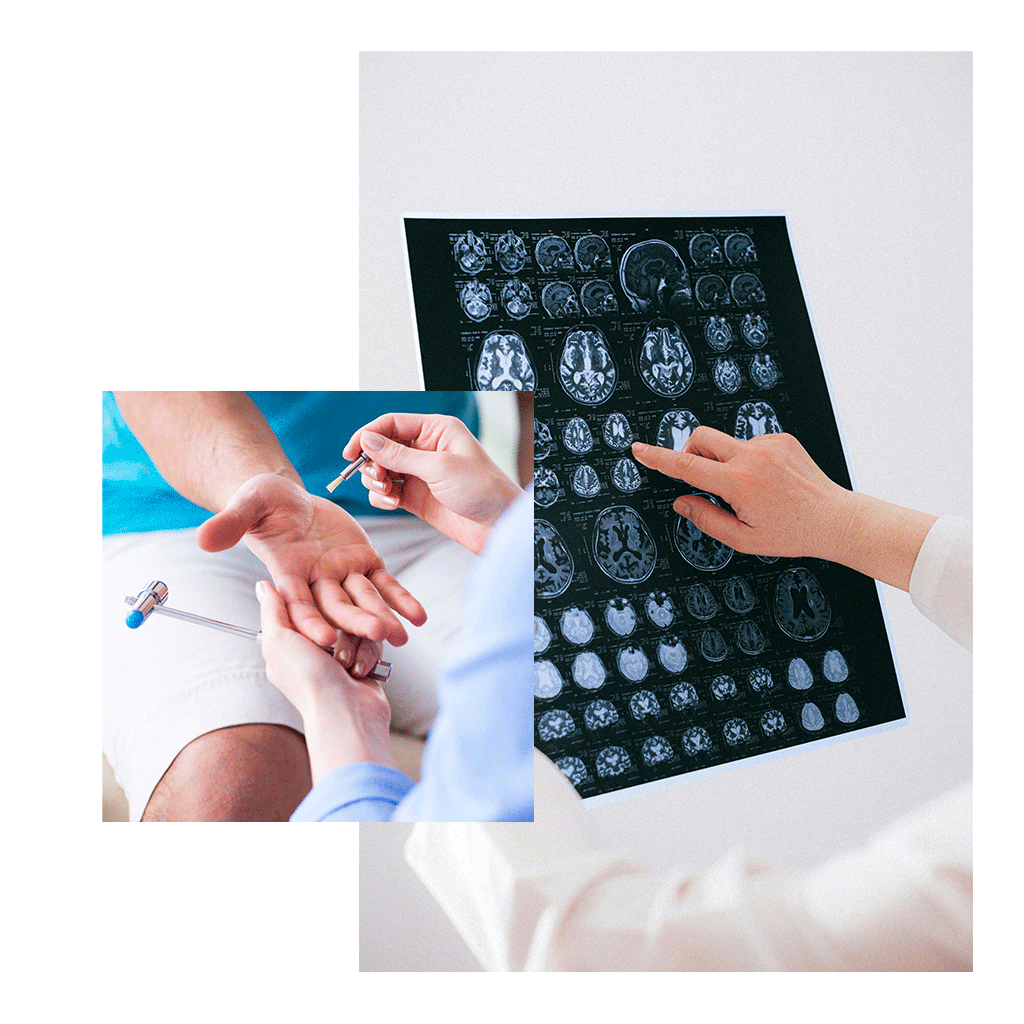 Evaluare clară — anamneză, examen neurologic (complet la clinică; ghidat online), corelare cu investigații.